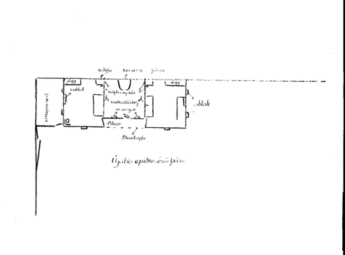 A ház szélessége 6 méter. Ebből azonban a szobák szélességére 5 m esik, mert 1 m a ház és udvar között, a ház hosszirányában a „pitar”-ra (pitvar) esik. A pitar régi házaknál az utcafronton derékszögben megtörik és az utcai oldalon folytatódik.41 A pitar 30 cm-es talpfája még egy félméteres kis deszkakerítéssel megmagasodik. Az újabb házaknál azonban ez a kerítés, sőt az utcai oldalon az egész pitar hiányzik.